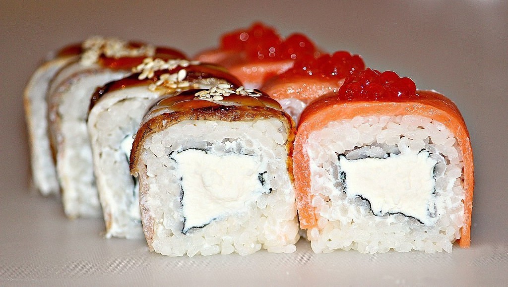 Ролл со сливочным сыром, обернут пластиками лосося и копченного угря. Украшен красной икрой, унаги соусом и кунжутом. 310 г.
