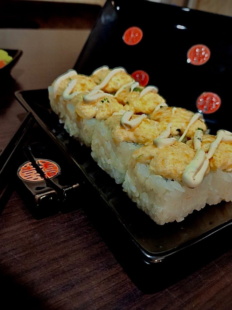 Рис.сливочный сыр,копченная курочка,помидор,лист салата,соус гауда,запеченный на гриле.