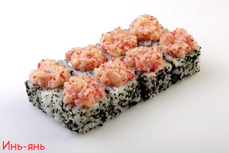 Ролл с тигровой креветкой, сливочным сыром и огурцом, обсыпан черным кунжутом, и украшен соусом на основе слабосоленого лосося и зеленого лука