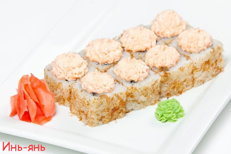 Рис, лососось в терияки, огурчик, сливочный сыр, обсыпан стружкой тунца, покрыт соусом лава.