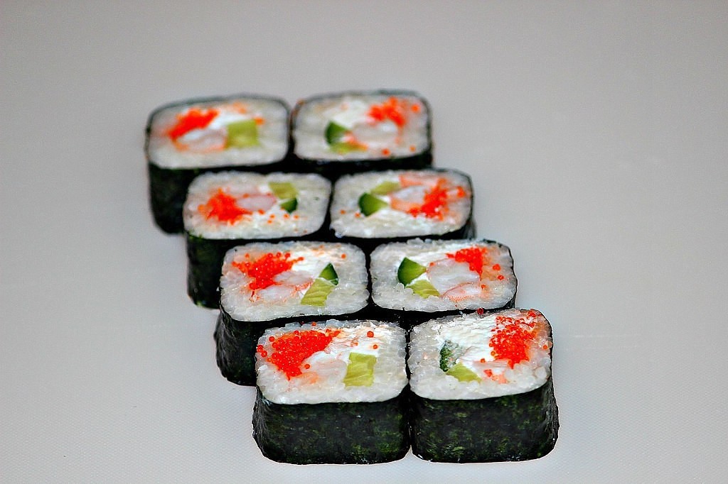 Ролл со сливочным сыром, креветкой, огурцом и икрой летучей рыбы.
